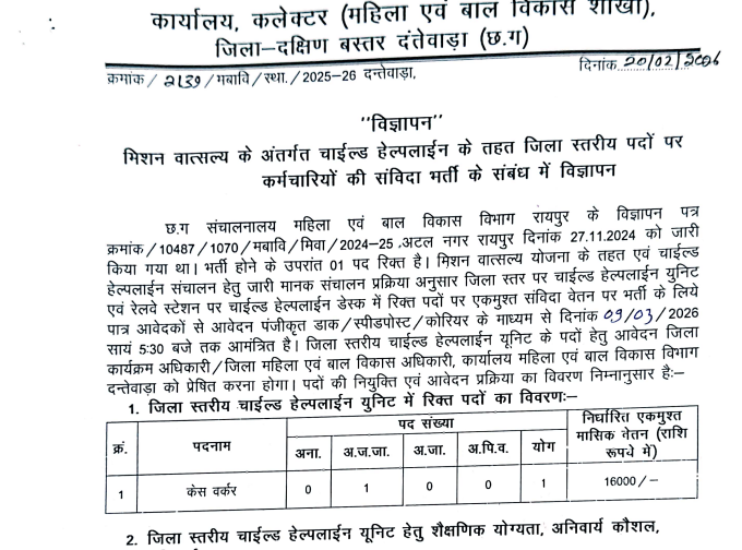 होम › सरकारी नौकरियां › महिला एवं बाल विकास विभाग धमतरी भर्ती 2026 प्रकाशित: 06.02.2026 आवेदन की अंतिम तिथि: 25.02.2026